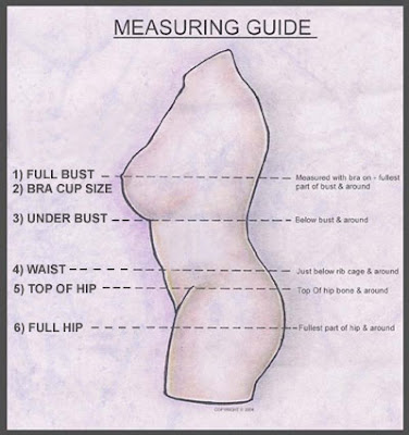Ask someone to help you take accurate measurements of your body in its natural shape. Find someone who doesn’t mind seeing you naked and never, ever try to take your own measurements. If you can’t find anyone, the lovely people at lingerie shops will be willing to help. I go through weight fluctuations sometimes and the sales girls at Victoria’s Secret are always willing to help you be certain that you are properly sized. So where should you measure your body? Here is an illustration to help you. Record the measurements in inches and centimeters. Standard sizes are done in inches but a good custom corset maker will do it in centimeters for a more snug fit.