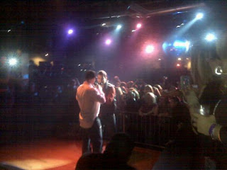 We all met at the club, which had no handicapped parking and valet was $20, so we self-parked in the strip mall next to the club to avoid the staggering drunks. Trust me, there were a lot of drunk girls. Johnny was walking around the line outside and of course people were trying to butter him up to get to Donnie. We didn’t though. I pretty much smiled and said hello and he cleared people out of the doorway so I could get inside. We all got drinks and staked out a spot along the railing by the stairs to keep people from standing in front of me so I could have a good view of the stage. This is after we got settled in our spot.
