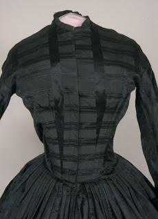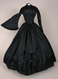 I believe that this dress was used for mourning. The lack of embellishment on the dress itself suggests the simplistic look that someone in the deepest stage of mourning was supposed to display. A widow, for example, typically went through different stages of mourning for about two years before she could fully rejoin society again. The stages of mourning ranged from solid black and seclusion to wearing purple and slowly rejoining society in the later stages.