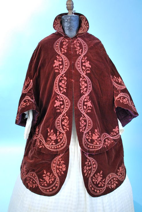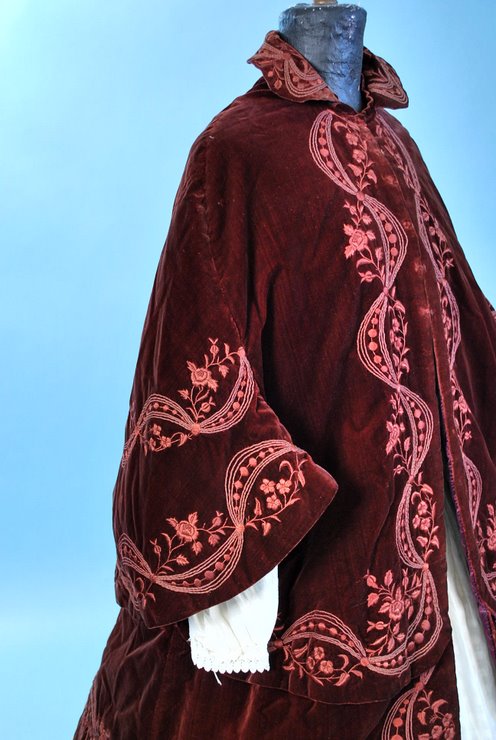 This particular cloak is gorgeous not only in its colors of burgundy and pink but also in its scrollwork detail. I don’t know very much about this mantle but it appears to be made of either wool or possibly some type of velvet. It’s more likely to be wool or a wool blend, however. The sleeves are bell-shaped, which are called pagoda sleeves, and the mantle fastens down the front with either hooks and eyes or frogs dyed pink to match the pink decorative detail. I cannot discern exactly what the pink detailing is made of but it might be silk embroidery or silk pieces sewn to the mantle. Most of the time, the details were made of silk if they were done that intricately.