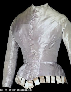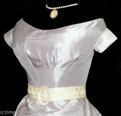 I found this dress rather interesting because of the two different bodices that were made to give the dress distinct looks. Multiple bodices used to go from day to night were fairly common throughout the nineteenth century but surviving examples of entire ensembles still together are not as common anymore. I can’t remember everything the eBay auction said but it appears to me that this dress is made of silk, probably silk taffeta, which was a common luxury fabric in the nineteenth century. The color is a lovely icy violet with white highlights and trim.